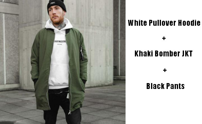 人気のボンバージャケット、こちらもカーキ、相性の良いカラーだ、春先になりアウターが必要なくなったら、レイヤードでパーーカーの下からシャツを覗かせるのもポイント!ガチャベルトとか長めに垂らしてもコーデのポイントになるよ!